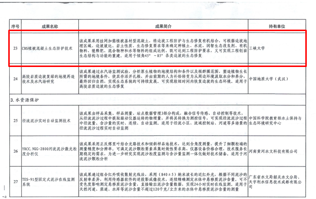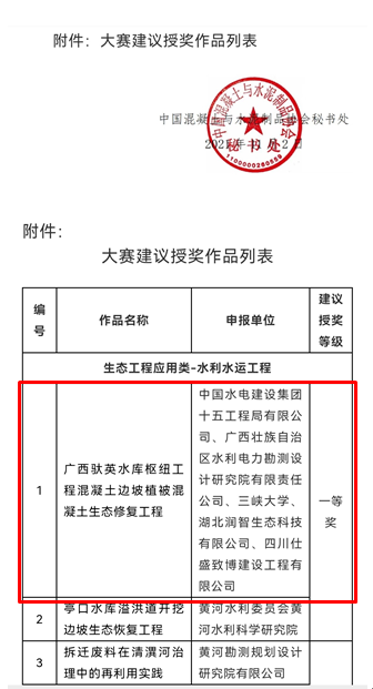 為深入貫徹落實(shí)習(xí)近平總書記關(guān)于保障國(guó)家水安全重要講話精神,積極推動(dòng)新階段水利高質(zhì)量發(fā)展,切實(shí)做好成熟適用水利科技成果推廣運(yùn)用,切實(shí)提高行業(yè)科技水平,水利部組織開展了2021年度成熟適用水利科技成果的征集、評(píng)審與公示工作。我公司研發(fā)的核心技術(shù)“CBS植被混凝土生態(tài)防護(hù)技術(shù)”獲得入選,其應(yīng)用項(xiàng)目“廣西馱英水庫(kù)樞紐工程混凝土邊坡植被混凝土生態(tài)修復(fù)工程”在2021年度“建華建材杯”第二屆全國(guó)生態(tài)混凝土創(chuàng)新設(shè)計(jì)應(yīng)用大賽榮獲一等獎(jiǎng)。