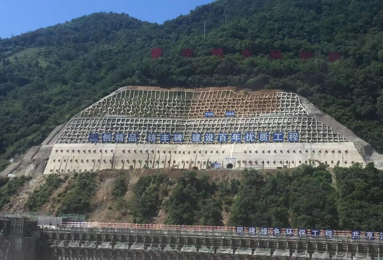 本工程試驗區(qū)位于黃金峽大壩右岸壩肩框格梁混凝土邊坡內(nèi),高程范圍為EL488m~EL512m,坡度接近1:0.35,框格梁尺寸約為2m*2m,預留排水孔,面積約7000㎡。2018年12月,經(jīng)項目部相關部門多方調(diào)研后,最終選用三峽大學潤智生態(tài)科技研究院的專利技術—植被混凝土生態(tài)修復技術對右壩肩框格梁邊坡以及其延伸段的一塊混凝土邊進行“引漢濟渭生態(tài)修復試驗工程”示范。如下圖所示:
